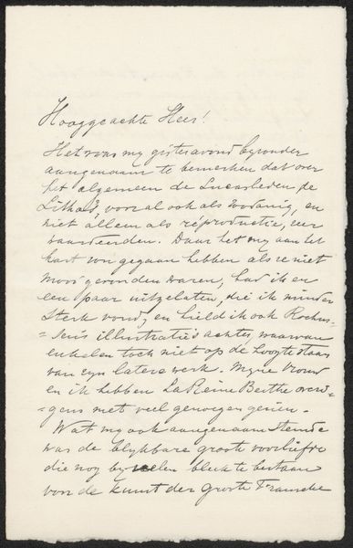 Curator: Here we have "Brief aan Jan Veth," a letter, likely from 1911, by Cornelis Gerardus 't Hooft. It's ink on paper, showcasing a beautiful example of calligraphy. Editor: The overall feeling I get is one of intense concentration. The density of the script, the way the ink almost bleeds into the paper in places... it speaks of urgency. Curator: I find that so interesting. Considering the limitations of writing materials at the time, and how precious paper would have been, there’s a sense of deliberate craft, almost a performance. Editor: Absolutely. The letter *is* the medium. 't Hooft isn't simply conveying information; the act of writing itself becomes part of the message. Look at the density of the lines, how they cluster. Was there a scarcity of paper or was this the author's usual style? Curator: It raises questions about the social context too. Jan Veth was an important artist and critic. This letter suggests a professional and likely personal connection between the two, reflecting the cultural circles they inhabited. What kind of artistic dialogue would these men be involved in, during the first world war era? Editor: A connection manifested through the materiality of ink and paper! And to consider how this physical object – a letter – then circulated within those networks, influencing ideas... I would say this artefact acts as a social and intellectual thread that pulls together diverse people. Curator: Indeed. A hand-written letter is a physical trace of the artist's hand, unlike digital mediums today. This really emphasizes the labor and care involved in artistic exchange at that time. Editor: This isn't simply a piece of information; it's a relic with a great tale. You almost feel like you have broken some kind of boundary when seeing such intimate communication! Curator: Precisely! This little snippet from a long lost artistic conversation holds its own presence to us.