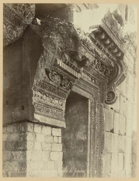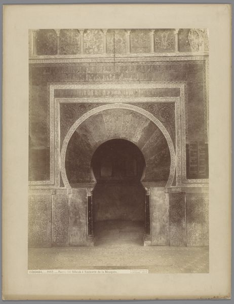 Curator: This fascinating photograph, taken between 1867 and 1877, by F\u00e9lix Bonfils, captures a section of the decorated arch of the summer pulpit within the Al-Aqsa Mosque on the Temple Mount in Jerusalem. The piece resides in the Rijksmuseum. Editor: Immediately, I’m struck by the sheer weight of history embedded within the stone. The monochrome image lends it a timeless quality. I see layers of cultural significance clinging to its surface. Curator: Absolutely. The Al-Aqsa Mosque is a crucial site in Islam. The arch, framing what would have been a vibrant, active space, possesses symbolic importance that is intensified through Bonfils' compositional choices, drawing focus on the site's legacy. Editor: It makes me think about the political realities interwoven with religious sites. Considering Bonfils was working during a period of intense colonial interest in the Middle East, how might his photography reflect those power dynamics? The act of capturing this sacred space transformed it into an object for Western consumption, and perhaps control. Curator: An insightful point. His work offers a visual archive of architectural and artistic features, allowing a form of cultural preservation. In viewing Bonfils’ documentation, we see the continuation of styles of ornamentation over generations and, furthermore, recognize how deeply symbols such as geometric designs are steeped in faith and community. Editor: Precisely. And let's not forget the photographic process itself. What visual cues emerge out of the interaction between nineteenth-century photographic technology and this ancient site? What's amplified and what's suppressed by its lens? Curator: Perhaps there’s a meditative element inherent in that stillness, calling forward the echoes of countless sermons within. It almost seems as though we’re glimpsing not just a structure, but an enduring idea, a historical landmark and a reflection on humanity’s constant attempt to build, define, and ultimately consecrate the spaces we hold most sacred. Editor: I agree. And looking at this, it’s vital we recognize how such places, both architecturally and ideologically, continue to shape our world and political discourses today.