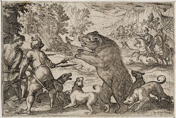 Curator: Allart van Everdingen's etching, "Bear cries out, Reynard hidden in bushes," presents a captivating scene. Editor: It's small, no bigger than my hand, but the raw emotion of the bear is immediately compelling. The stark contrasts give it a dramatic feel. Curator: The image taps into a broader tradition of animal fables, where animals become symbols of human follies and virtues. Here, the crying bear evokes vulnerability. Editor: And the material itself—etching—allowed for detailed lines that really highlight the texture of the fur and the rugged landscape. How was this consumed, do you think? Curator: Prints like these were often part of larger suites, telling a narrative, or collected individually. The bear’s cry might symbolize injustice or loss, depending on the viewer's interpretation. Editor: It's fascinating how such a small, relatively inexpensive object could carry so much symbolic weight and be widely disseminated. Curator: It truly is. Etchings like this one remind us of the power of images to communicate complex ideas. Editor: Exactly, and to see the bear rendered with such care using, relatively simple tools is quite remarkable.