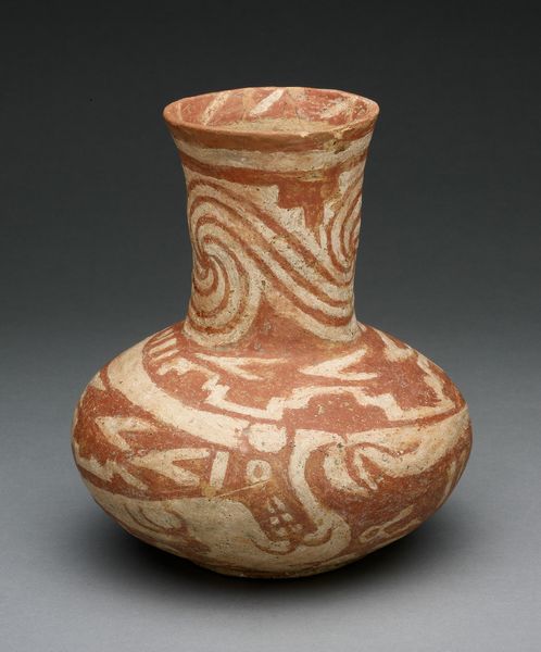 Editor: We’re looking at a Ceremonial Vessel, probably from the late 19th century, made of terracotta. It’s got a striking head with multiple faces near the spout. I’m intrigued by the geometric patterns around the upper body. What structural elements do you find most compelling about this piece? Curator: Notice first the ovoid form of the vessel itself; it's an essay in simple curves. Then observe how that pure shape is disrupted and articulated by the contrasting angular patterns etched across its surface. The crispness of the incised lines plays dramatically against the smooth volume below. Do you perceive how the head and neck act as a mediating zone between those opposing languages? Editor: Yes, now that you mention it, the smooth curves leading up to the geometric patterns, then transitioning to the sculptural head creates a series of distinct visual zones. It’s a very conscious design. But I’m unsure about the repetition of the faces at the top. Does it represent more than simple repetition? Curator: In a formalist reading, repetition establishes rhythm, which itself is a foundational principle of order and meaning. Consider the way the echoed features create a layered effect, altering our perception of depth and volume. Rather than individual faces, it seems to point to a higher symbolic purpose. What do you believe is the importance of these geometric figures placed as decoration around the top of the pot? Editor: Good point! The doubling might indicate an elevated social position, or connection to spiritual authority, instead of being mere duplication. And the triangles create an effect of both symmetry and dynamic motion, the balance in their shape provides movement, and a visual direction that forces the viewer’s eyes up the body. Thanks, I will certainly have a sharper perspective after our chat today. Curator: It’s often the case that scrutinizing these relationships between form and pattern illuminates unseen avenues for aesthetic interpretation. It’s exciting that something crafted from earthen material can trigger abstract reflection.
