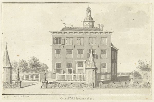 Curator: This is Joseph Mulder’s “Voorzijde van Kasteel Gunterstein, Breukelen,” created sometime between 1680 and 1696. It's a landscape showcasing the architecture of the era through detailed engraving. Editor: My immediate reaction is a sense of formality and contained energy. The linear precision gives it structure, but the scattering of figures and animals softens it. Curator: Absolutely. Mulder's command of the engraving technique highlights the architectural grandeur—the symmetrical facade, the sculpted details. It evokes the aspirations and the social structures of the Dutch Golden Age. Editor: It's fascinating how the symmetry provides a grounding element but isn't perfectly mirrored. I'm drawn to the interplay of line and space, how the solid forms of the architecture contrast with the softer lines used to delineate the figures and foliage. Curator: Consider, too, the symbolism implicit in the depiction of the estate itself. Castles like Gunterstein weren't just homes, they were symbols of status, wealth, and familial lineage. Each detail served as a signifier of power and permanence. The figures gathered evoke daily life but also hint at prosperity, order and well being. Editor: The print medium adds another layer. Engravings were reproducible, enabling wider dissemination of imagery and associated values to an expanding merchant class. It transforms a private symbol into a publicly accessible one. Curator: Precisely. Mulder’s engraving contributes to a visual lexicon reinforcing societal values, and perhaps gently idealizing the lives within such estates. There is a subtle aspiration at play, suggesting the values to strive for. Editor: For me, thinking about its composition, the verticality emphasized by the castle's form speaks of stability, whereas the activity below gives the scene narrative life. The figures populating the forecourt offer a sense of human scale and a bit of the bustle of ordinary existence against the structured background. Curator: It offers a slice of life, carefully rendered, that also transmits enduring cultural ideals about wealth and belonging. The past continues to speak. Editor: The artwork invites contemplation, reflecting the society’s aspirations and underlying structures, visible still in its rendering.