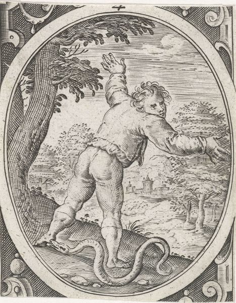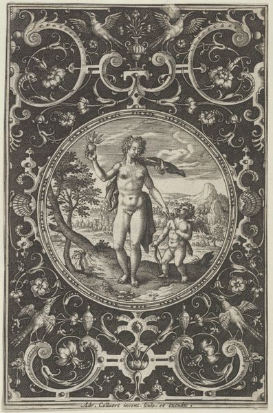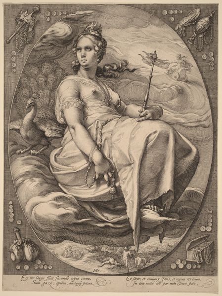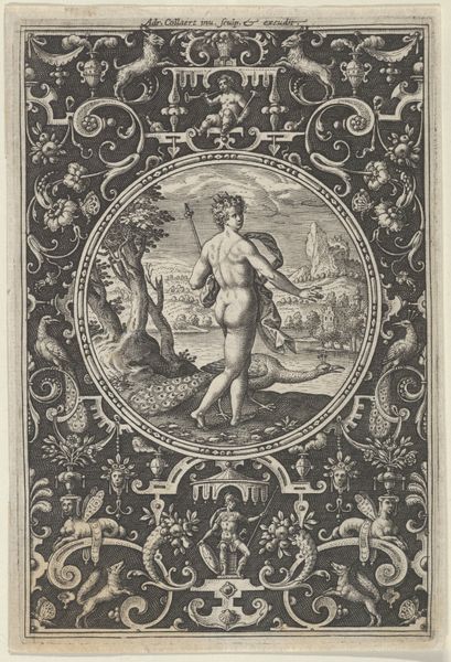 Heinrich Ulrich created this engraving, *Aiolos, Personification of Wind*, in the late 16th century. The image is dominated by the figure of Aiolos, rendered with a striking muscularity, who stands on a seashell amidst a turbulent sea. A large cloth billows out behind him, suggesting the force of the wind he embodies. Ulrich’s formal approach is fascinating. The composition is meticulously organized within an oval frame adorned with objects alluding to science and war. This juxtaposition highlights the tense relationship between natural forces and human endeavours. The artist has skillfully employed line and texture, using dense, cross-hatched lines to convey a sense of movement and depth, particularly in the rendering of the sea and the billowing cloth. The figure of Aiolos disrupts classical ideals. He's caught in a moment of action, his body twisted, challenging the viewer's gaze and destabilizing fixed meanings. This work reflects a broader philosophical interest in how humans interact with and attempt to control powerful natural phenomena. Ulrich’s detailed engraving suggests the complexities inherent in our attempts to classify and govern the uncontrollable aspects of our world.