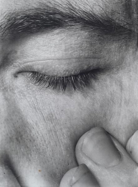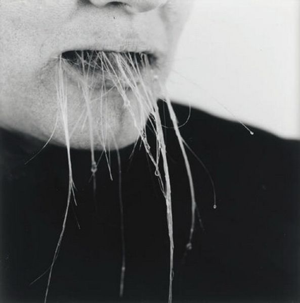 Curator: Before us, we have a black and white photograph by Jim Goldberg titled "I'm Dave (mouth)", likely created sometime between 1988 and 1994. It's a gelatin-silver print. Editor: The immediate impression is raw and unfiltered. The close-up perspective on just the mouth, rendered in stark monochrome, creates an unsettling intimacy. There's a certain brutal honesty in its form. Curator: The choice of isolating the mouth is powerful. Across cultures, the mouth is laden with symbolism, representing speech, consumption, sensuality. It’s the origin of both sustenance and communication. Goldberg isolates it, forcing us to contemplate what Dave's mouth might signify in this context. Editor: The photographic technique, the way the light falls and creates these textures, heightens that sense of vulnerability. The stark contrast almost turns the flesh into a landscape, focusing our attention on the slight imperfections and emphasizing a powerful and simple message. Curator: Goldberg often uses his work to explore marginalized communities and individual narratives. Could this be about Dave's voice, his story being confined, suppressed, or perhaps ready to be unleashed? A potent cultural symbol of a time that needed stories like this to be seen. Editor: Absolutely, the framing creates an intensity, and maybe a commentary on the disembodied nature of representation itself. It reminds me a little of structuralist ideas around signifiers and signified, only in the grittiest, most corporeal way imaginable. Curator: It is interesting how you call this out, because historically this connects us with different views on what the human face, or just the mouth signifies, and what memories and culture references emerge. It might represent completely different values from different viewers that engage with this image. Editor: It gives you plenty to chew on! No pun intended. Curator: Indeed. The simplicity is deceptive; a lifetime of stories hides behind that mouth.