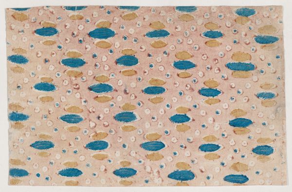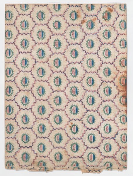 This patterned sheet, made by an anonymous artist, features rows of red designs on an overall pattern of ovals. It's printed, most likely using a wood block printing technique. The process involves carving a design into a wooden block, inking it, and pressing it onto the fabric. This was a common method for producing textiles quickly and relatively cheaply. Notice how the regularity of the pattern creates an overall visual texture, almost like a field of tiny flowers. The repetition speaks to industrialization and textile manufacturing, where designs could be endlessly replicated for a growing consumer market. The choice of a simple, repeating oval motif, along with the limited color palette, suggests a practical, rather than purely decorative, purpose. This sheet bridges the space between fine art and everyday design, prompting us to consider the labor and social context embedded in even the most modest of patterned textiles.