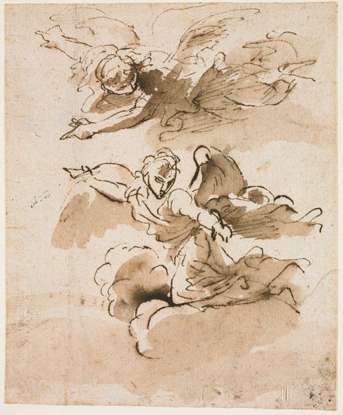 Salvator Rosa made this drawing, "Studies of Kneeling Figures," using pen and brown ink over traces of graphite. The composition teems with figures, each rendered with dynamic lines and tonal washes that evoke a sense of movement and drama. Rosa masterfully uses line to define the forms, creating a play of light and shadow through varying line weights and densities. The figures are not static; they twist and turn, their gestures expressive and emotive. This dynamism, achieved through the formal elements of line and composition, reflects a Baroque sensibility that emphasizes movement and emotional intensity. The arrangement of figures suggests a narrative, perhaps a scene of supplication or revelation. Rosa's skill lies in his ability to convey a sense of depth and complexity through the economy of his line and wash. The drawing invites us to consider the formal elements at play and the potential narratives they suggest, reminding us that even in a study, Rosa was a master of dramatic expression.