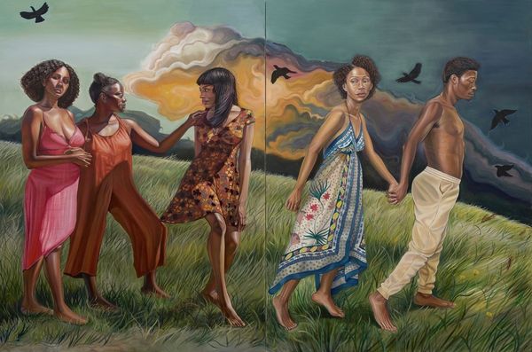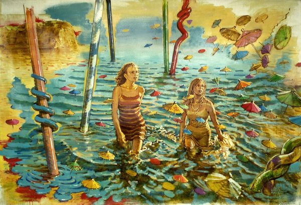 Editor: This is "Resurgence of the People," a mixed-media painting by Kent Monkman, created in 2019. It immediately strikes me as both chaotic and hopeful, a feeling emphasized by the turbulent waves and determined faces. What do you see in this piece, especially regarding its cultural symbolism? Curator: The immediate resonance is its potent invocation of the collective unconscious. This image carries visual echoes of Delacroix's "Liberty Leading the People" and Gericault's "Raft of the Medusa," doesn't it? Both paintings depict historical struggle. Monkman employs those archetypes, recasting them within an Indigenous framework. Notice the artist cleverly places uniformed gunmen at the shore—does that imagery invoke thoughts of colonization? Editor: It does. They seem poised to attack, but are failing to intimidate the figures on the water. There is this powerful figurehead too, adorned in red. Who might this refer to? Curator: Ah, that’s Miss Chief Eagle Testickle, Monkman's gender-bending alter ego. Miss Chief often disrupts established narratives of power. The fluidity of her gender becomes a potent symbol against rigid colonial structures, right? She leads this "resurgence," challenging viewers to question history's dominant narratives. Editor: That's such an impactful statement! So the overall composition becomes an assertion of Indigenous resilience through art historical and contemporary symbols. Curator: Precisely. It is a vibrant, deliberately disruptive assertion, and challenges viewers to critically examine ingrained cultural memory, as well as who controls that narrative. It begs us to consider what “resurgence” truly signifies. Editor: This really changes how I view the piece. I see now the artist utilizes the shared visual vocabulary of historical paintings to connect with very contemporary conversations of Indigenous experiences and nationhood. Curator: Yes, Monkman is indeed engaging the weight of collective memory in fascinating ways. He transforms and reclaims art history.