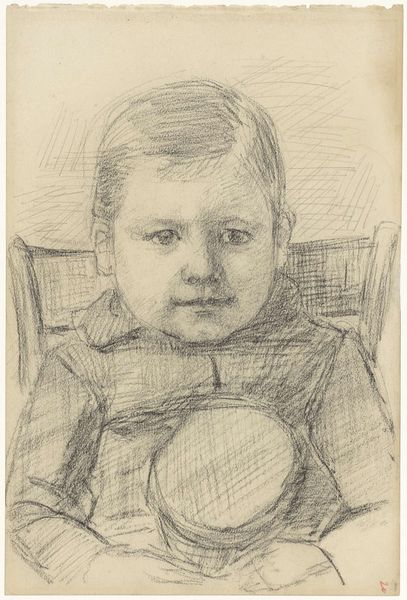 Curator: What a compelling image! This is "Kinderkopje," or "Child's Head," a pencil drawing on toned paper by Jozef Israëls, dating from sometime between 1834 and 1911. It currently resides in the Rijksmuseum. What strikes you about it? Editor: Immediately, it's the directness of the gaze that hits me. There's a lack of idealization, almost stark in its realism. I can’t help but wonder, who was this child, and what social strata did they occupy that Israëls chose to depict them so plainly? Curator: Israëls was known for his depictions of working-class individuals and the poor. Considering his social consciousness, the simplicity of the medium – a pencil drawing, easily accessible, inexpensive toned paper– really reinforces the theme of everyday life. It emphasizes process, showing rather than concealing the tools and materials he used. Editor: Exactly. And Israëls’ interest in Realism extends beyond simply depicting their likeness; it seems to grapple with questions of identity and representation in a quickly industrializing Dutch society. The light pencil work adds a layer of complexity. What kind of childhood was this? What did representation mean for a child within the era's burgeoning concept of labor? Curator: I agree; it's tempting to speculate about the socio-economic forces at play that shaped Israëls artistic choices here. The looseness of the sketching, the unfinished quality, speaks to the raw realities that he seems intent on revealing rather than obscuring. This type of sketchbook art makes it raw and in your face as you are standing next to the drawing, rather than a polished painting in a fancy gold frame. Editor: Precisely, a subtle statement on access, class and portraiture's democratization. It also evokes a sense of vulnerability that, within its time, invites critical conversation about art's accessibility, labor, and even childhood as a defined phase. I feel like it connects Dutch Golden age to Impressionism by documenting the child in an accessible means, for all viewers to enjoy. Curator: Absolutely, it's a thought-provoking piece on so many levels. From the materials and their accessibility to the questions it raises about society and representation. Editor: Yes, Jozef Israëls really gave us something significant to chew on with this work. The implications within this drawing seem like they are endless to discover and research!