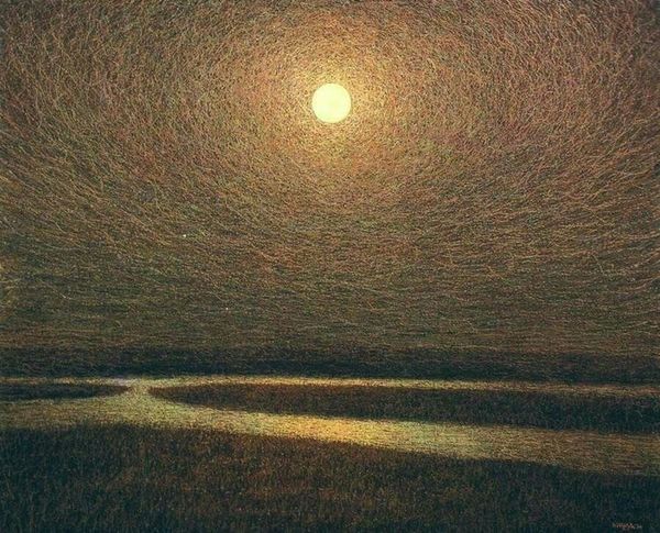 Curator: Nicholas Roerich's “Himalayas with Setting Moon,” painted in 1943, captures a seemingly quiet yet evocative moment. What are your initial thoughts on this landscape? Editor: It strikes me as both serene and unsettling. That luminous moon against the gradient of that bruised, reddish sky creates an undeniably captivating yet strange atmosphere. The Romanticism movement and the idea of sublime beauty gone awry maybe. Curator: Let’s delve deeper into the materiality and the making of this image. Roerich was, as you know, deeply immersed in the landscape. "Himalayas with Setting Moon" uses oil paints, possibly applied *en plein air,* though his practice involved memory-based work too. His brushstrokes aren't labored or hyperrealistic but the impasto certainly creates visual texture. What does the physicality of this work evoke in terms of artistic labor? Editor: It brings up Roerich’s complex relationship to nationalism and spiritualism. The Himalayas for Roerich and his followers represented a zone for mystical journeys. That golden light hitting the waters appears less a gentle touch than a sort of sublime manifestation. Roerich clearly saw landscape and nature as something more than surface impressions. I’m reminded of how figures like Blavatsky promoted esoteric views on Tibet—ones with troubling legacies on orientalist perspectives in Europe. Curator: Certainly. From a materialist view, this relates to the consumption of art that promotes ideas and ideologies. Here, Roerich wasn't simply capturing a scene; his travels and engagement with theosophy shaped what he put on canvas. His technique – the broad, expressive brushwork - facilitated the transmission of this loaded landscape painting. I’d argue the application method helps further ideas central to spiritualism. Editor: Right, because if the labor were highly visible it may come across as less an "instant," and instead a painstakingly built manifestation of spiritual insight. Curator: Yes, in his time Roerich saw painting as work in service to promoting a philosophy of universal unity. Now, knowing the details of its execution, it's fair to say the legacy surrounding his paintings warrants further interrogation. Editor: Precisely. As compelling as this work is aesthetically, we can’t ignore the web of meaning around its production. These works force us to question how even a tranquil scene contains historical narratives embedded in the oil paint. Curator: A crucial point to remember.
