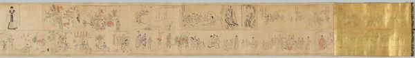 Curator: Here we have "(Asakusa Kannon temple caricatures A)" by Awashima Kangetsu, circa 1900. The piece resides here at the Minneapolis Institute of Art. Editor: The immediate impression is one of lightness and quickness. The watercolor washes are so delicate and the line work seems spontaneous. There's an appealing economy to the composition. Curator: Absolutely. It's fascinating how Kangetsu captured these religious figures. Asakusa Kannon Temple was and remains an incredibly popular destination. Consider that the figures are presented as caricatures. How does that potentially democratize access or commentary surrounding traditionally austere or rigid images of worship? Editor: I'm interested in how the artist isolates the essence of each form. Observe, for instance, how certain facial features are simply suggested by a delicate curve, and how effectively those curves imply a whole character. The use of negative space becomes just as important as the drawn line itself. Curator: It speaks to the dynamic societal shifts in Meiji-era Japan. The piece likely served as social commentary, reflecting perhaps the increasing accessibility and familiarity with religious spaces amidst urbanization and modernization. Kangetsu isn’t merely representing deities, they are capturing a changing relationship between the public and established religion. Editor: It’s worth noticing, too, the repetitive rhythm created by the haloes. Those lightly colored circles act as visual anchors, tying all the figures together in a unified plane despite the variety in pose and expression. Curator: Exactly. By imbuing them with a sense of relatable humanity, we're drawn to consider who holds the power to define sacredness, and how those definitions shift. Editor: Well, seeing how efficiently the artist has deployed line, shape and colour here has reminded me how to judge what is fundamental to the success of an artwork. Curator: Thinking about how art interacts with evolving cultural norms will continue to shape how I study artworks going forward.