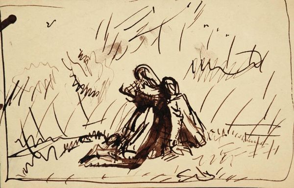 Edwin Austin Abbey made this sketch in graphite and wash on paper. The drawing appears spontaneous, with loosely sketched figures and landscape elements. The materiality of the medium itself contributes to the narrative, the immediacy of the graphite lines imbuing it with urgency. The artist's choice of materials is intriguing. Graphite, a relatively inexpensive material, is used in conjunction with wash. The wash technique gives depth and atmosphere, while simultaneously obscuring details, suggesting a world of secrets and hidden meanings. The lack of precision could be a commentary on the fleeting nature of wealth, or the moral ambiguity surrounding its pursuit. The swiftness of the sketch hints at the artist's perspective on the labor and time invested in accumulating wealth versus the speed at which it can be acquired through exploitation. Understanding the materials and methods used can provide insight into the artwork's cultural and social commentary.