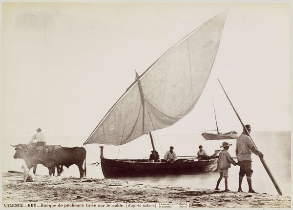 Editor: This is "Indian Whalers Homeward Bound from the Pacific," a gelatin-silver print by Asahel Curtis, created around 1910. It feels incredibly lonely and stark, the small boat almost swallowed by the vast sea and sky. How do you interpret the symbolism in this photograph? Curator: The monochromatic tones themselves lend a sense of timelessness, a visual cue that transports us to the past but also evokes a sense of continuity. Water, here, isn’t just a background. Water represents the unconscious, where symbolic imagery rises from the depths of personal and cultural memory. Consider how this image of a homecoming touches on the collective experiences of these indigenous whalers. Editor: Homecoming… it makes me think of both relief and maybe the hardship endured. What kind of stories could those men tell? Curator: Precisely. The direction the boat is headed, the slight lean in the sail suggests that struggle. But what’s fascinating is what the photograph doesn't show us: The nature of their catch, any clear markers of triumph or failure, the expressions on the men's faces. These absenses compel us to consider the psychological weight of their journey and the narratives that may exist within their community about such voyages. Do you think that adds another layer to it? Editor: Definitely! It is compelling to see this image not as a simple depiction of labor, but of cultural resilience. It gives such depth to the journey of the Indian Whalers. Curator: It is in that very tension - what’s visible and what’s obscured - where we see the real potency of visual symbols, offering us fragmented narratives we piece together to find deeper meaning.