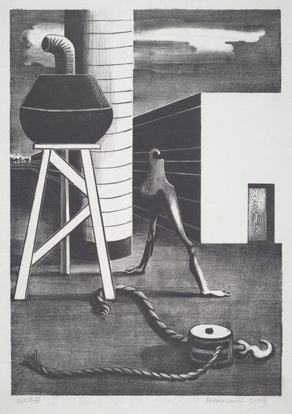 Curator: This compelling drawing, “Hexagram 41,” was completed in 1985 by Oleksandr Aksinin. The piece is made with ink on paper, using geometric and symbolic figurations. Editor: There’s something unsettling about the composition, with that slumped-over, almost architectural form. And is that a dice resting near its limp hand? Curator: Aksinin was part of the Lviv graphic art school, and his work often reflected the dissident intellectual circles operating within the late Soviet Union. The symbolism is rich, though at times obscured. You can clearly read it through the historical lens of Soviet oppression. Editor: It feels like a dreamscape populated with the detritus of power. What strikes me is how the flower at the top contrasts so sharply with the rest of the scene. Like a beacon of fragile hope in a suffocating atmosphere. Curator: Exactly. And the text running along the bottom acts almost like a barrier, doesn’t it? An obstruction to clear understanding or freedom of thought. Editor: Do you see it as a critique of the political regime, or a wider statement on the human condition? The dice especially hints at the inherent risks and absurdities that permeate even quotidian activities. Curator: I see both at play. Aksinin experienced censorship, and “Hexagram 41,” in its visual language, hints at a societal state of decay, mirroring the larger anxieties regarding freedom. But it also points to personal experiences, with recurring imagery such as human figures combined with architectural fragments. Editor: This makes sense. Knowing the context adds a layer of gravity to this haunting image. Aksinin transformed these personal and socio-political frustrations into potent and universally relatable symbolic works. Curator: Definitely. It stands as a potent commentary on power, oppression, and the enduring strength of the human spirit during an era of repression. Editor: Looking at it now, one can't help but imagine the brave figures working underground, finding in these artistic pieces new ways to navigate harsh political realities.