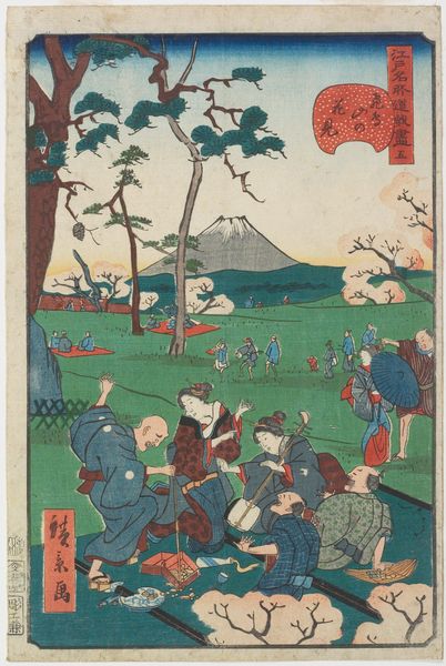 Editor: So, this woodblock print is titled "79 Shiba Shinmei Shrine and Zōjōji Temple" by Utagawa Hiroshige, created around 1857. The crowd in the foreground really grabs my attention – there's a sense of movement, a shared purpose maybe? What symbols do you see woven into this scene? Curator: The most prominent symbol, repeated across the composition, is the circle. Note the umbrellas held high above the people, repeated shapes in the architecture of both temple and shrine. These aren’t just casual shapes. The circle, in Shinto and Buddhist traditions, represents the infinite, enlightenment, a sense of unity and continuity. Does that resonance change your perception? Editor: Absolutely, the circle as unity makes so much sense. Are the people themselves symbolic in any way? Curator: The figures themselves offer a glimpse into the social tapestry of Edo period Japan. The monks, easily identifiable by their attire, represent established religious institutions. But look at the ordinary people interspersed; what might their presence within a sacred space suggest to you? Editor: Perhaps the blurring of boundaries between the sacred and the mundane, faith as part of daily life? Curator: Precisely. Utagawa skillfully interweaves symbols of the spiritual and everyday worlds. The temple and shrine coexisting reflect a tolerance of different religious views, speaking volumes about cultural identity and acceptance. Do you feel that message holds relevance today? Editor: I think so. Finding harmony amidst differing beliefs feels eternally relevant. Thanks, that deeper dive really transformed how I view this piece. Curator: Indeed, by unlocking symbolic layers we enrich our connection to art, bridging time and cultures through visual language.