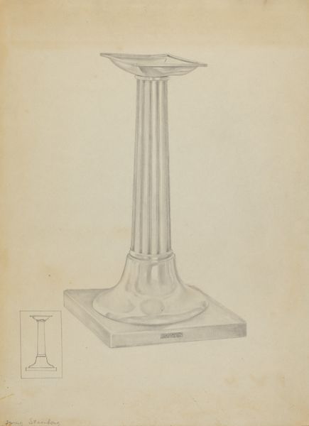 Curator: Here we have Michael Fenga's "Silver Snuffer Stand," a pencil drawing created around 1936. What are your initial thoughts on this piece? Editor: Austere, certainly. The cool grey tones and precise rendering create a sense of formality, even detachment. The meticulous hatching gives the imagined silver surface a subtle gleam. Curator: The snuffer stand, particularly its geometric design and structured planes, reveals a fascinating dialogue between form and function. Notice how each section builds upon the last, creating a hierarchical visual structure. Editor: Ah, yes, the hierarchy is quite overt. The base adorned with a dragon gives way to the globular body, culminating in that imposing box featuring a double-headed eagle. Each band, a symbol layered atop another. What do you make of these symbolic choices? Curator: Dragons and eagles frequently denote strength, power, perhaps even imperial ambitions. Their placement here is strategic; one might even interpret the stand as a visual manifestation of dominance, each element building on the iconography of the last. The artist presents us with visual ideas regarding cultural permanence. Editor: The contrast between the mythical beast at the base, steeped in folklore, and the classical eagle motif is fascinating. This juxtaposition pulls in references from various epochs to imbue the piece with authority. I’d suggest this speaks volumes about continuity through cultural memory. Curator: Continuity and adaptation is palpable throughout the form, creating new artistic perspectives by combining visual traditions. It exemplifies how design can transcend mere functionality, communicating ideologies, or even narratives of historical evolution through materiality alone. Editor: I find the study as a whole a thought-provoking demonstration of art as a vessel for historical motifs, as we have decoded in the design a tangible presence through the application of iconography. Curator: It’s through that very juxtaposition of traditional and modern forms we arrive at its significance as an artwork – beyond representation, into an aesthetic examination of objecthood.
