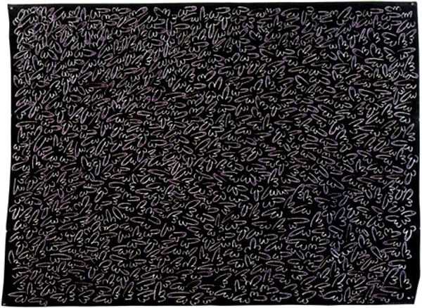 Curator: This work, an untitled print by David Leverett, now residing in the Tate Collections, is a fascinating example of abstract expression. It's roughly 600 by 900 millimeters. Editor: Wow, it feels like looking into a dense thicket, a visual representation of pure, untamed energy. Curator: Leverett's mark-making really draws you in. It seems the interplay between those cool blues and earthy reds creates a sense of depth. Editor: It almost vibrates, doesn't it? Like static electricity, or the hum of a hidden frequency. It's fascinating that such chaos can feel so… contained. Curator: Well, perhaps that containment is a reflection of the grid that seems to structure it, a visual metaphor for the tension between order and chaos that plays out across the surface. Editor: Right, like something barely contained by the systems it is built into. There's a freedom there, a sense of something untamed, ready to burst forth. Curator: Ultimately, I think Leverett wants us to experience that tension, to feel the exhilarating edge between control and release. Editor: Beautifully put. It leaves you feeling almost breathless.