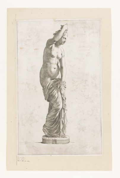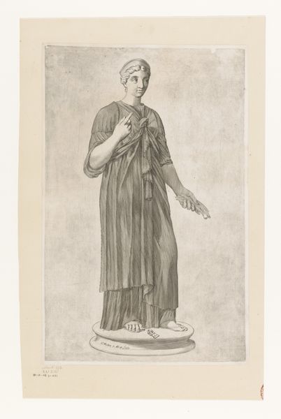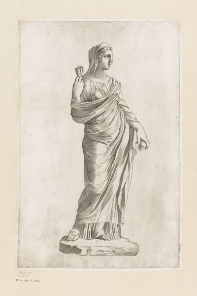Editor: Here we have Claude Mellan's "Statue of a Vestal Virgin," an engraving from the 1630s. It strikes me as both classical and slightly austere. What's your interpretation of this work? Curator: Well, this engraving invites us to consider the complexities surrounding representations of women, particularly in historical contexts. How does this image of a Vestal Virgin, a woman defined by her chastity and service to the Roman state, speak to issues of power and constraint? Editor: So you see the engraving as commenting on the limited roles afforded to women in that period? Curator: Precisely. Mellan's meticulous lines capture a figure confined by societal expectations. Her pose, her gaze – are these signs of piety, or of enforced obedience? We must question the artist’s intentions, considering his own position within a patriarchal society. Does he idealize this figure, or does the image carry a subtle critique? Consider also that the Vesta Virgins held unusual privileges for women. How does that influence our reading? Editor: It's interesting to consider that duality - confinement versus privilege. Is it possible to see an element of female strength, too? Her hand is firmly on her hip; she seems resolute. Curator: Absolutely. And it’s crucial to recognize the layers of meaning within historical representation. By questioning the seemingly straightforward image, we confront the enduring challenge of interpreting female agency in art. Editor: That gives me so much to think about regarding female representation and artistic intent. Thanks for pointing that out. Curator: It’s a pleasure. Art should provoke critical thinking.