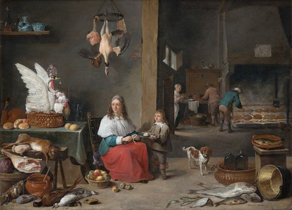 "The Cooker" by Bartolomé Estebán Murillo presents a scene teeming with life, rendered in oil on canvas with a keen eye for detail. The composition is structured around the central figure of the cooker, her form anchoring the chaos of the kitchen setting. Murillo uses chiaroscuro to dramatic effect; the light illuminates the woman, the animals, and the cooking implements. The use of shadow serves to define the edges and contours of forms, adding depth and realism to the scene. The gaze of the dog in the lower left is a key element. It intersects with the gaze of the woman to draw attention to the act of preparing food, an intersection point that hints at the structures of daily life. This creates meaning through the visual relationships established between the objects, the figures, and the implied social dynamics. Murillo's painting is a rich tapestry of visual and cultural signs, inviting a reading of everyday life through the lens of art. The image reminds us that even seemingly simple scenes are complex sites of meaning-making.