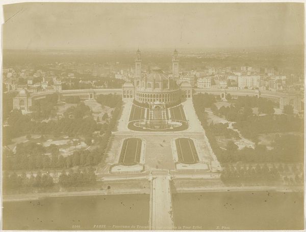 Curator: Let's turn our attention to "Gezicht op het Place du Caroussel vanuit het Louvre in Parijs, op de achtergrond de Tuilerieën," a photograph captured sometime between 1887 and 1900. The photographer is identified as X. Phot. Editor: Immediately, I'm struck by the formality. The photograph creates distance, it is as if we are seeing Paris from a privileged position, elevated and separated from the street. Curator: That's a fascinating take, the position definitely frames the viewpoint. I think the composition shows an embrace of Japonisme's aesthetic. The placement and angle capture an ephemeral feeling similar to Japanese prints which made their way into Europe at the time. Editor: Interesting, because for me the neutral sepia tone, paired with the rigid geometry of Parisian architecture evokes an image of authority, and recalls France’s imperial power. Haussmann's redesign of Paris, completed just a few decades prior, was an imposition of order onto the chaotic urban landscape, displacing communities and reinforcing social hierarchies. Curator: I do see the imposing feel. The angle may be less about imposing a "sense of order", but rather more a depiction of life from the high rises beginning to show up during the late 19th century. To me it expresses more modern anxieties or a commentary on the flâneur experience, that detachment when wandering through a busy cityscape. Editor: I suppose this detachment, and new visual experience could offer insight into urban life... who was allowed to gaze from this elevated position and whose experiences were rendered invisible. Curator: The play of light is beautiful, though. Even with what looks like an overcast day, the architectural detail is prominent, almost creating a secondary symbolic perspective of the rising social structures and class. Editor: And there is a historical truth in the material reality and social relations of Paris in the late 19th century. Curator: Exactly, in short, both of these concepts can coincide, existing not as contradictions, but simply a play on symbols over time. Editor: Perhaps our modern anxieties about historical erasures have shifted our perspectives of what power used to mean.