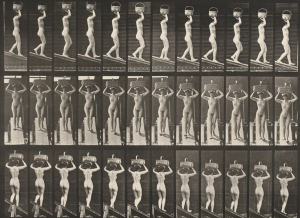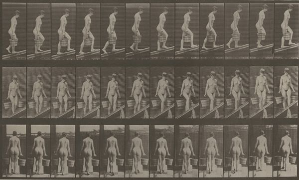 Editor: Okay, so we’re looking at Eadweard Muybridge’s "Plate Number 74. Ascending an incline," a gelatin-silver print from 1887. It's a sequence of images showing a nude man walking up a slope. It feels almost clinical in its depiction, like a scientific study. How do you interpret the significance of Muybridge’s work in its time? Curator: Precisely! You’ve touched upon the core tension of Muybridge’s practice. These images weren’t purely about artistic expression; they were deeply embedded in scientific inquiry and social reform. Remember, this was an era obsessed with scientific positivism, believing that empirical observation could unlock all truths. Muybridge provided "objective" evidence of human movement, initially to settle a bet about whether all four hooves of a horse leave the ground at once during a gallop. What does that initial purpose tell us? Editor: That the artistic value, in this case, wasn't necessarily the point? Curator: Exactly. It became foundational for motion studies in science, yes, but it was shown at art exhibitions! His work played a vital role in shaping visual culture, particularly our understanding of the body, movement, and the power of the photographic image itself. The nudity is also very calculated, not provocative but serving a perceived scientific objectivity, though, of course, never truly neutral. How does the arrangement – the grid – influence your reading? Editor: I see how the grid format emphasizes the analytical nature, breaking down the movement into discrete units and underscoring the scientific intention. It seems Muybridge’s work sits right at the intersection of art, science, and cultural observation, which makes it incredibly compelling. Curator: Precisely, its impact lies in revealing not only how we see but how we understand, categorize, and ultimately, control and disseminate knowledge. It makes you think about the social function of art. Editor: I’ll definitely view Muybridge's work with a much broader historical perspective from now on. Thanks!