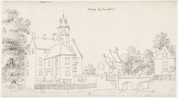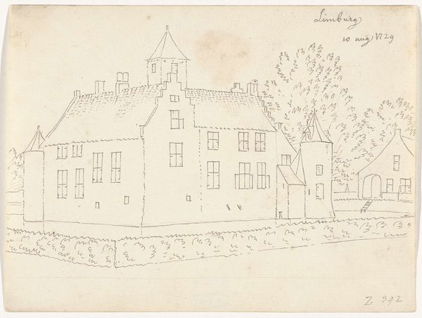 Curator: This is a work called "Het kasteel Limburg," attributed to Cornelis Pronk, possibly created in 1729. It’s an ink drawing on paper, currently held here at the Rijksmuseum. Editor: My first impression? It's whimsical, almost like a daydream. The lines are so delicate, it feels incredibly intimate, like peeking into the artist's sketchbook. Curator: Exactly! It possesses that wonderful quality of immediacy. Pronk’s style, rooted in the Baroque, captures more than just the architectural details of this castle; he also conveys a sense of place and time. The sketchy quality also places it more in the realm of design, than final representation. Editor: I'm fascinated by the choice of ink. It provides such sharp contrast but simultaneously feels fragile. What draws me in is the way the castle seems almost to be rising out of the water, like a fortress of dreams or memories. It feels archetypal in a strange way. Curator: Think of the symbolism inherent in castles; they often represent power, security, and sometimes isolation. Surrounded by water, this castle takes on an added layer of protection, or perhaps a feeling of being set apart from the world. You can almost feel Pronk mulling this over as he experiments in rendering different depths. Editor: It's interesting you mention that, it could represent aspiration or perhaps even yearning, to go deeper. We are literally held at bay, as viewers by the water surrounding it. Looking closer, it seems he’s included faint notes and measurements; these inclusions lend an aura of historical record. Curator: Yes, elements of survey and even record, but ultimately it reads very fresh to a contemporary eye. Perhaps a direct reflection of human endeavour; to observe, record and translate. Editor: Well, it's definitely ignited my imagination. I see more than just lines on paper; it's a story waiting to be written, a history silently whispered. It reminds us that even simple sketches can hold vast reserves of emotional and cultural meaning. Curator: Absolutely, and that is part of Pronk's charm. Even within what appears simple, worlds can exist if we let them.