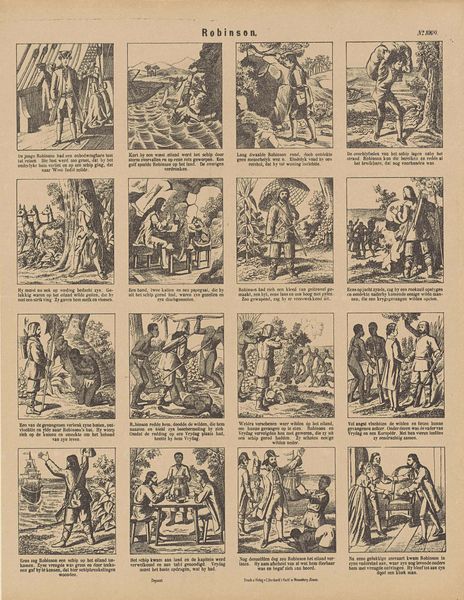 Editor: Here we have "Geschiedenis van Ezelsvel / Histoire de Peau-d'ane," which roughly translates to "History of Donkey Skin." Created between 1833 and 1911 by Brepols & Dierckx Zoon, and housed at the Rijksmuseum. It’s a print, an engraving really, showing sequential scenes. It reminds me of an early comic strip! What jumps out at you? Curator: It feels like stepping into a half-remembered dream, doesn't it? Those delicate lines, weaving a narrative that both invites and obscures. Notice how each panel is like a tiny stage, characters frozen mid-gesture, leaving so much to the imagination. Makes you wonder about the unspoken dramas unfolding between each scene, right? Does it spark any particular feeling in you? Editor: There's definitely a fairytale quality to it. A bit dark, perhaps, with secrets lurking. It makes me think, what audience would this kind of narrative appeal to back then? Curator: That’s a brilliant question. Consider the era - 19th century - and the rise of print culture. These kinds of prints were hugely popular, making stories accessible to a wider audience. So, fairytales…moral tales…packaged in an easily consumable visual format. It's also a potent reflection on societal values, right? Think of the roles of women, the power dynamics... does it evoke anything specific? Editor: I didn't catch all of that on first glance. I was too focused on the images themselves. This makes me appreciate it more! Curator: Absolutely! And you know, it’s like finding a lost key to a room we didn’t even know existed! It invites us to play detective, to fill in the gaps, and, just maybe, to create our own little dramas in response.