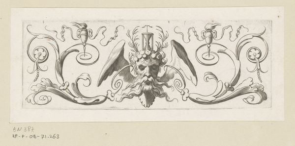 Curator: Claude Mellan's "Cul-de-lampe met leeuwenkop," dating from 1639 to 1643, is an exquisite engraving housed here at the Rijksmuseum. Editor: What immediately strikes me is the almost haunting balance of severity and playful ornament. There's a structural rigidity, yes, but tempered by these swirling Baroque flourishes. Curator: Indeed. Mellan was a master of line, evident here in the pure engraving technique—all form is described through variations in the width and density of the lines themselves, devoid of hatching or cross-hatching. It’s a display of virtuosic control. Editor: But what do you make of the…odd symbolism? We have the stylized lion head, almost Greco-Roman in its stoicism, and then this bizarre festoon beneath, fruit mingling with what appear to be olive branches. There is an inherent drama between organic and rigid elements. Curator: The lion, traditionally a symbol of power and courage, is rendered in a somewhat softened manner here, isn't it? Its usual ferocity is tempered, integrated into the decorative scrollwork. I believe that this is intended as ornament: it’s the tailpiece for a print or book. Editor: Of course, a subtle conclusion, in service of the text and imagery. Given that this piece likely marked the conclusion of some grand pronouncement, what kind of symbolism might we be seeing within these strange combinations? Victory? Sacrifice? Perhaps there is both. The leaves bring peace while the fruit could mean success and rewards? Curator: Intriguing, as this era delighted in layers of embedded meaning within its imagery. It might also simply be a celebration of abundance and protection offered by the lion’s strength, now made calm. Editor: Ultimately, what I find fascinating is how Mellan managed to achieve such textural complexity with just a single tool and such formal simplicity. It compels the viewer to slow down and study, uncovering these little, odd things, Curator: It’s a beautiful testament to the power of focused attention, indeed!