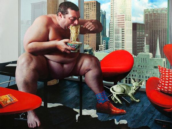 Curator: Rolf Ohst’s “Birdy 1,” completed in 2016, strikes me with its stark juxtaposition of fragility and mass, captured so intimately in oil on canvas. What’s your initial impression? Editor: My eye is immediately drawn to the tiny bird perched precariously on the man's finger. Birds often symbolize freedom, the soul, even divinity. Here, its contrast with the earthbound figure is really evocative. It also has a beautiful link with other religious paintings. Curator: Precisely! Consider the sociopolitical commentary. This isn't the typical hero we often see depicted in art history; rather, it's an unidealized man. In modern contexts, it could be argued that it’s challenging conventional norms and stereotypes surrounding the male body and masculinity in contemporary art. Editor: Yes, the artist dares to challenge ideals of masculine beauty and its classical precedents. But let’s look closer—that specific bird, is it identifiable? And how does its presence complicate the interpretation of the male figure? Are we looking at a commentary on man’s relationship with nature, perhaps? A symbol for the care or lack thereof that one should have with themselves? Curator: The bird, visually, suggests a gentle tameness – juxtaposed with a figure bearing very human marks: folds, weight, a softness challenging prevailing ideals. Perhaps this reveals anxieties surrounding image and body politics, touching upon critical ideas concerning representation, spectatorship, and power dynamics in art. Editor: Or could the bird be a stand-in for something else? For tenderness? Hope? Transformation? Artists throughout time have given birds complex connotations—what could that signal in this painting, with this modern subject? There’s also this interesting interplay with this very personal choice in the image. Curator: That’s a critical point – thinking intersectionally, what narratives intersect in Ohst’s work, and what assumptions are we bringing to the table about vulnerability, physicality, and the relationship between humans and other species? Editor: Considering its symbolic significance and its careful application, "Birdy 1" becomes an almost meditative piece when thinking about cultural meaning. The symbolism woven into the fabric, it subtly suggests deeper psychological undertones that resonate powerfully across time. Curator: An incredibly nuanced approach, connecting the individual to broader societal structures and historical consciousness. The work's potency truly stems from this critical interplay between image, identity, and representation. Editor: Exactly. By deciphering symbols and allusions in "Birdy 1," we access more than the aesthetic surface; we confront enduring narratives and our place within the grand tapestry of history.