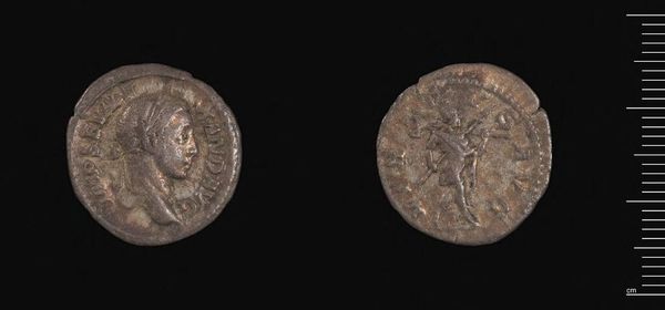Curator: Here we have a Denarius of Elagabalus, part of the Harvard Art Museums collection, a coin showcasing a portrait of the controversial Roman emperor. Editor: It looks so small and worn, yet brimming with power. Silver, I imagine? The images are striking, even in this state of decay. Curator: Indeed. Elagabalus's reign was marked by religious reform and social upheaval. The coin presents his image, but also points to his attempt to impose the cult of Sol Invictus, represented by the deity on the reverse. Editor: So, these aren't just portraits; they're ideological statements, carefully chosen symbols crafted to legitimize power and project a certain persona. The sun god, then, becomes a visual tool. Curator: Precisely. And the numismatic evidence offers vital insight into the strategies Elagabalus employed to shape public perception. It failed, of course, and he faced severe backlash for his radical religious policies. Editor: It's fascinating how such a tiny object can hold so much historical weight, revealing the intersection of power, religion, and identity in ancient Rome. Curator: Absolutely. It's a potent reminder that material culture can provide invaluable perspectives on marginalized or misrepresented figures throughout history.