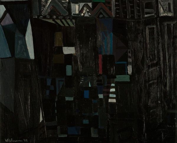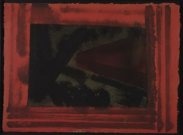 Editor: This is Howard Hodgkin's "Artist and Model," housed at the Tate. It's so striking with its bold use of black and ochre. What stories do you see in this piece? Curator: I see a commentary on the male gaze. Hodgkin obscures the model's identity, reducing her to a silhouette within a constructed space. It begs the question, who holds the power in this interaction and why? Editor: So, it's not just a depiction of a scene, but also a critique? Curator: Precisely! Consider the historical context: male artists frequently objectified female models. Hodgkin seems to be acknowledging, perhaps even challenging, that dynamic through abstraction. What do you think? Editor: I hadn't considered that angle. Now I see the work in a completely different, more critical light. Curator: Art holds a mirror to society, reflecting its values and biases.