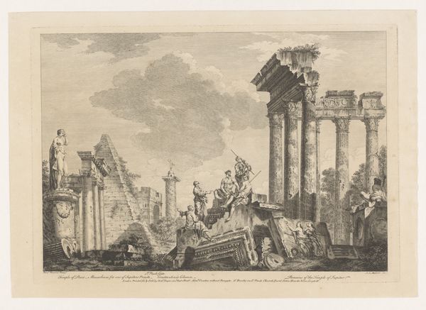 Curator: "Vier mannen en vrouw redeneren tussen de antieke ruïnes"— "Four Men and a Woman Reasoning Among Ancient Ruins." This print, an etching to be exact, comes to us from the 18th century and bears the signature of Johann Sebastian Müller. It's rendered in a style that fuses academic art and classical realism. Editor: At first glance, it's a bit mournful, isn’t it? That stark monochromatic palette contrasting with such grandeur feels… melancholic. Ruins always bring that feeling, a poignant meditation on time's relentless march. Curator: Exactly! Think of the materiality here: ink on paper. A relatively accessible medium transformed into a scene of opulent decay. The figures themselves seem almost lost amidst the colossal ruins, their very presence a sort of consumption or repurposing of this space. Editor: You know, it’s curious how the engraver makes these precise marks. It really invites one to question ideas of value. Is the true value in the labour, the paper, or in its function, its impact on social memory? It seems such labour goes into commemorating the legacy of wealthy antiquity in this academic-style composition! Curator: And history painting too! Remember, prints like this served a crucial role, distributing knowledge and taste in the Enlightenment. Suddenly everyone had a way to access and engage with these ancient motifs. They become almost, dare I say, democratized! Editor: Democratization... by way of meticulous reproduction. What contradictions we encounter here, but a wonderful opportunity to study the social forces encoded within this printmaking labor! I might even take a chance in finding other copies of this to look for discrepancies between prints as potential areas to better understand labor history of each print. Curator: A fascinating prospect! It is just mesmerizing how these ruined sculptures whisper secrets of their lost lives. Editor: Definitely a melancholic monument captured with incredible artisanship! Curator: Indeed, a space where art, craft, and society meet.