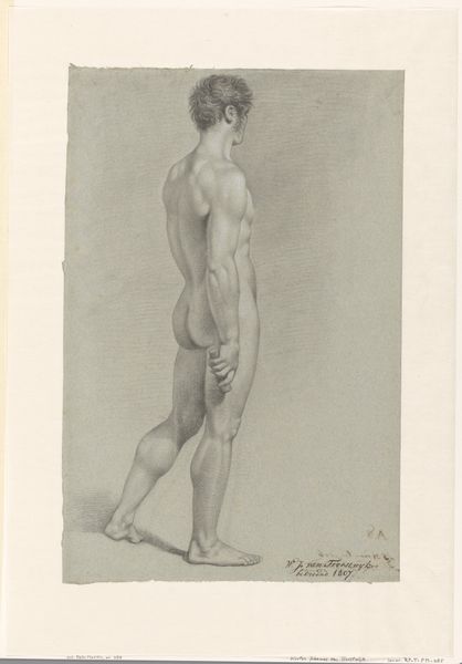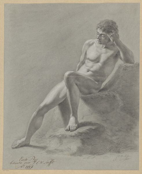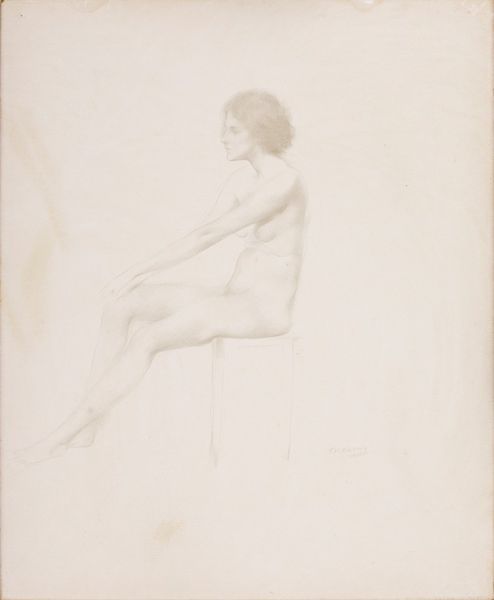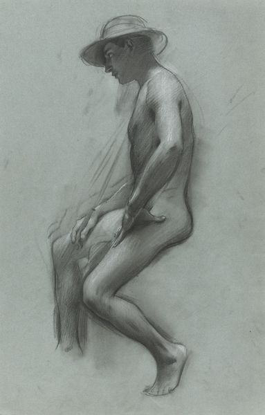 Editor: We are looking at "Sitting Boy," a charcoal drawing by Jozef Hanula. I am struck by the seeming casualness of the pose contrasted with the highly detailed and classical treatment of the figure. What can you tell me about the social context for a drawing like this? Curator: That contrast you notice is quite telling. On one hand, this is clearly an academic study, focusing on anatomical accuracy, probably created within a formal art education setting. The use of charcoal, the limited palette, and the focus on form over expression all point to that. But you see academic art being harnessed to project nationalist and aesthetic messages within certain European social contexts at this time. How might this representation, idealized and depoliticized, actually reflect, or perhaps even mask, anxieties around ideas of physical and national identity at the time this work was made? Editor: So, the seeming objectivity is actually a conscious construction? I hadn’t thought of it that way. It feels almost like a sanitized, controlled version of the male nude, for what purpose? Curator: Exactly. Consider the relationship between the artist, the model, and the implied viewer. Who held power in that dynamic, and how was that power being expressed through the careful staging and rendering of the figure? Where might this have been displayed, and for whose consumption? And importantly, does knowing something about Jozef Hanula help us understand the possible layers in this depiction? Editor: It sounds like unpacking the ‘simple’ representation of the ‘Sitting Boy’ takes us into some really complex social territory about power and representation in academic art. Thanks! Curator: Yes, precisely. I’ll certainly be considering it more from that viewpoint moving forward.
