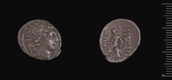 Curator: Here we have a silver tetradrachm, a coin minted by Antiochos Hierax of Syria. It weighs just over 16 grams. Editor: It’s amazing, isn’t it? This little disc feels heavy with history, almost like holding a tiny, metallic echo. Curator: Indeed. On one side, we see a portrait of Antiochos himself, rendered with a clear attention to detail, capturing a sense of royal authority. Editor: And on the reverse, a figure seated—a deity, perhaps? The pose is graceful, but the whole composition feels quite still, self-contained. Curator: Yes, it’s Apollo, seated on the omphalos. Coins like these were not just currency; they were powerful statements, visual reminders of a ruler's legitimacy and reach. Editor: I imagine the artisan painstakingly engraving each die. Knowing that this coin may have passed through so many hands, witnessing untold stories…it’s quite humbling. Curator: Absolutely. It's a tangible link to a distant past, offering us glimpses into the lives and beliefs of those who came before. Editor: A little world in the palm of your hand. Something about its muted tones makes me think of whispered secrets.