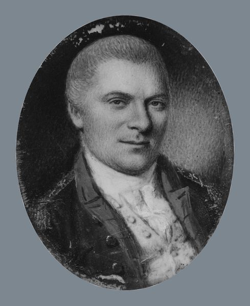 Curator: Before us, we have "James G. Almy," a portrait created between 1795 and 1798 by Edward Greene Malbone. It's currently housed here at the Metropolitan Museum of Art. Editor: The piece definitely exudes a quiet elegance, almost somber. There’s a striking contrast in tones, emphasizing Almy's features. The oval format is intimate, drawing you closer to his likeness. Curator: Malbone was quite prolific, highly regarded for his miniatures, though he worked in larger formats, too. It's interesting to consider the specific labor and materials involved: the delicate brushstrokes, the support he used, how that influences our experience now. What survives in this condition speaks to deliberate craftsmanship. Editor: Absolutely. This portrait really speaks to a burgeoning American identity in the late 18th century, one where the wealthy merchant class, represented here by Almy, is establishing itself, visually marking their place in society through commissioned art. Look closely at his attire. That austere, dark coat and tightly wound cravat convey so much. What do you make of the way it reinforces a social hierarchy? Curator: The subdued palette further highlights a shift away from overt displays of wealth. One can argue it's a reflection of mercantile ideals: industriousness, reliability... Perhaps it hints at Almy's societal role? Editor: And the way he's looking slightly off to the side could also convey subtle disquiet amidst the certainty of new money. There’s something melancholic there, despite the trappings of status. How did he perceive his rapidly changing world? What compromises were made as he became a prominent player in it? These are key issues to investigate through portraits such as this. Curator: This prompts us to consider not just what the artist wanted to represent but also what the sitter sought to project about themselves. Editor: Examining "James G. Almy" pushes us to critically look at identity, class, and the formation of social and historical narratives in early America. Curator: Indeed. Appreciating its materiality provides access into those more significant and contextualized realms.