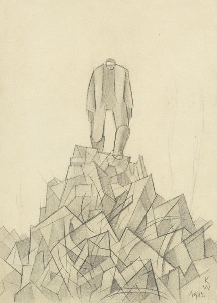 Curator: Karl Wiener's graphite drawing, "Vom Tod zum Morgen," created in 1941, presents us with a disquieting vision. What strikes you first? Editor: It's the angularity, definitely. The geometric forms of the buildings, almost like unstable cubes, give the whole composition a sense of impending collapse or disorientation. Curator: Precisely. Consider the historical context. This was created during the height of World War II. The distorted cityscape, the faceless crowd, and the stark title—"From Death to Morning"— powerfully reflect the anxieties and existential dread of the era. Editor: The Expressionistic style amplifies that dread. There’s a clear departure from mimetic representation towards an emotional reality, especially in the unsettling, wide-eyed figures in the foreground. The sketch book aesthetic, complete with light toning, softens that feeling, in contradiction. Curator: It’s also important to look at Wiener's position as an artist during this period. He was working under immense political pressure, his art deemed "degenerate" by the Nazi regime. This drawing could be read as an act of quiet resistance, encoding critique within a seemingly simple cityscape. Editor: The contrast between the geometric abstraction of the buildings and the more realistically rendered figures creates a visual dissonance. It forces you to consider the individual within the urban structure, a lone face in an oppressive crowd. Is the morning literal, or symbolic of renewal of spirit in a post-war context? Curator: Yes, and I find the symbolism complex, oscillating from modernism and embracing elements of social commentary but using visual encoding, hinting toward resilience of those experiencing intense violence. Editor: This sketch encourages us to think of how design choices are influenced and even dominated by historical events to explore form and message within our reading of artworks. Curator: Precisely. A stark and lasting commentary.