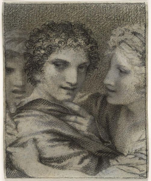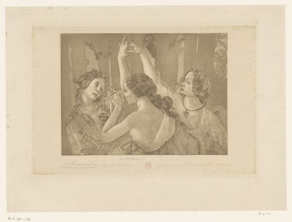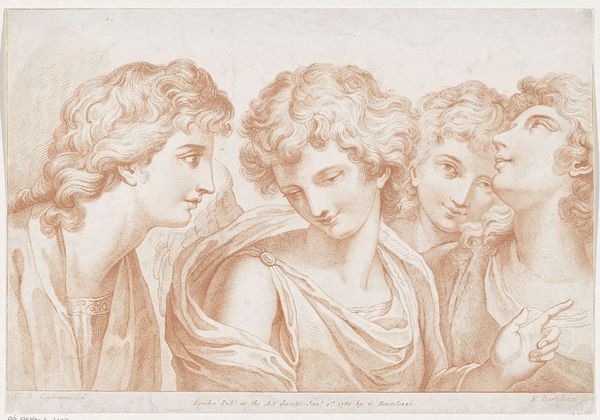 Curator: Looking at "Vier engelen", an engraving attributed to Francesco Bartolozzi, possibly created in 1796, the first thing that strikes me is its tranquil stillness, even considering the activity depicted. Editor: Tranquil, yes, but there’s a subtle sense of…anticipation? All four figures seem to be gazing toward the same unseen spectacle. Their expressions are charged with expectancy. Are these angels witnessing something? Curator: The neoclassical style, with its idealised figures and flowing drapery, definitely points to a cultural interest in representing purity and grace. In historical paintings, such features were frequently employed as allegories for virtues or significant individuals within society, so perhaps that’s at work here, too. Editor: Good point. In looking closer at the gestures, there’s almost a pedagogical quality to them. The figure with the raised finger could be a teacher, guiding others on where, or how, to look. We cannot underestimate the role of engraving during the enlightenment to spread new political ideas in popular forms accessible to the public. It reminds us how revolutionary thoughts often wore the mask of classical idealism. Curator: It’s an intriguing proposition! What fascinates me further is the psychological element embedded in the collective gaze. The sense of longing in their countenances hints at more profound themes, like faith, hope, and transcendence – universal ideals in the baroque period. It presents cultural memory, linking back to prior collective understandings of what an angel is. Editor: Well, consider that Bartolozzi was working in London, a city in social and political ferment, at a time when public access to imagery was becoming more common. It reflects a shift in visual culture. Who controlled the images and who got to view them became a contested issue in the public imagination. This image in and of itself thus became a political entity. Curator: Certainly, viewing "Vier engelen," a beautiful conversation opens regarding its cultural and historical significance and visual potency as an aesthetic object. Editor: Exactly, the convergence of visual culture, accessible artistry and cultural meaning render the work powerful and provocative still.