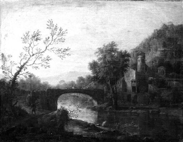 Jan Griffier painted this "Fantasy of Mountain Scenery" using oil on canvas. At first glance, the composition seems to evoke a sense of serene, romantic grandeur. The painting is dominated by crumbling architectural elements, a lush tree, and figures in a landscape that invites the viewer into a world of imagined antiquity. Griffier uses the interplay of light and shadow to structure the painting. Notice how the delicate application of tone, ranging from deep blacks to soft grays, sculpts the forms of the ruins and foliage. The contrast emphasizes the scene's theatricality. The arrangement of the ruins and the strategic placement of the figures create a stage-like effect, inviting the viewer to contemplate themes of time, memory, and the transience of human endeavor. Consider the way the artist employed the classical elements of landscape to structure a scene that transcends mere representation. It presents us with a carefully constructed vision that continues to resonate with philosophical notions about humanity's relationship to nature and history.