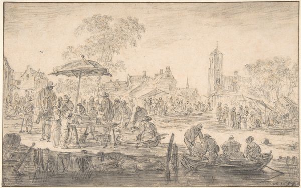 Editor: This is Isaac van Ostade’s "Distribution of the Catch by Night," created sometime between 1635 and 1649 using ink. It gives off a casual but somewhat ominous feel with its shadowy monochrome and busy composition. How do you interpret the visual arrangement of the drawing? Curator: Note the masterful application of washes which establish spatial recession. The architecture to the left exhibits a tangible presence created by strong value contrasts; conversely, forms recede towards the picture plane's center as line weights diminish, delineating atmospheric depth and recession. Does this strategic control of tonal value guide the viewer's gaze into the composition, effectively controlling their reading of the visual space? Editor: Yes, it's quite subtle but noticeable. I hadn't considered how deliberate those washes are. The lines seem rougher near the people, however. Curator: Consider those figures—do their placements augment the central convergence established by architecture and depth? The carefully orchestrated chaos of human activity, meticulously drawn yet blurred enough to remain impressionistic, is counterbalanced with architectural exactitude in the background and creates a semiotic tension. Editor: I see what you mean. The crisp architecture and hazy human activity form a stark contrast. This tension keeps the composition dynamic and engaging. Curator: Precisely. And the dynamism in tandem with carefully graded washes offers much insight. Editor: I now have a stronger understanding of how the individual formal choices influence the overall experience. Curator: Indeed, a closer examination of form offers avenues to interpret meaning.