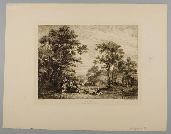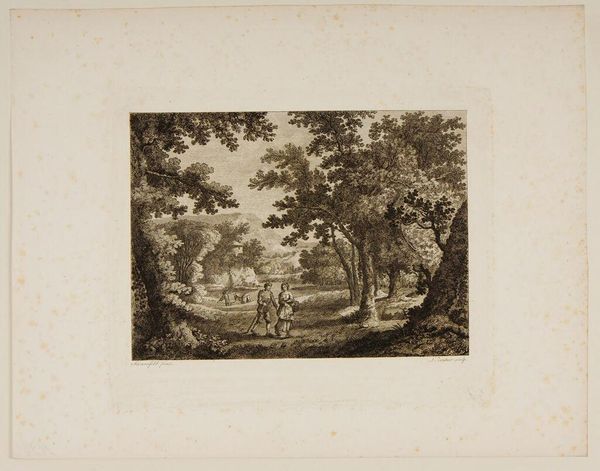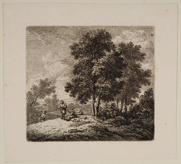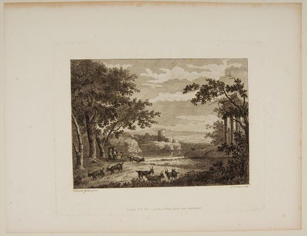 Curator: Here we have "Herdsman Tending Cattle," an intriguing piece by J. L. L. C. Zentner, part of the Harvard Art Museums collection. Editor: It's… surprisingly serene. Almost dreamlike, in its muted tones. The scene is quiet, pastoral even. I can almost smell the earth. Curator: Zentner really captured the essence of the landscape, didn't he? Note how the trees frame the composition, leading your eye towards the distant, clouded sky. Editor: The balance is striking. The dark foreground versus that hazy background creates an illusion of depth, pulling you into the scene. It's like a memory, fading at the edges. Curator: Indeed, and the choice of a monochrome palette emphasizes form and structure, stripping away the distraction of color. Editor: It evokes a certain nostalgia. A simpler time, perhaps? It's a peaceful scene, expertly rendered. I find it oddly comforting. Curator: A beautiful balance between technique and emotion, wouldn't you agree? Editor: Absolutely. It's a reminder that even in simplicity, great art can reside.