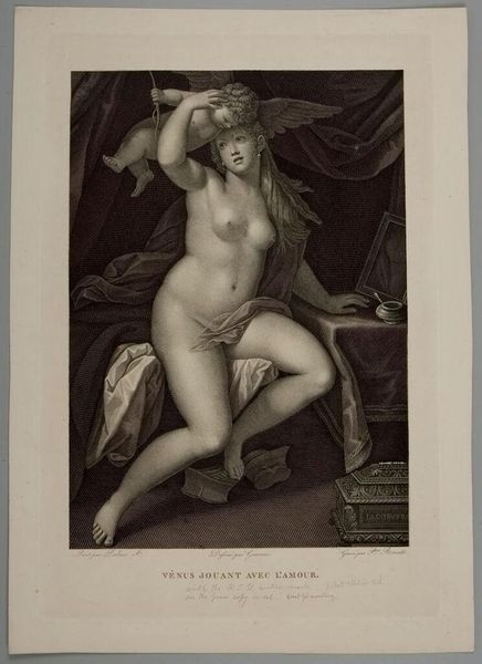 Editor: This is "Venus" by Abraham Raimbach. I am struck by the contrast between Venus's serene expression and the mischievous cherubs peeking through the foliage. What's your take? Curator: It's fascinating how Raimbach's print circulated images of idealized beauty within a specific social context. Who was consuming these images, and what did Venus represent to them? Was it purely aesthetic pleasure, or did it also signify power and status? Editor: So, this image wouldn't just be about art for art's sake? Curator: Precisely. Images like this were powerful tools in shaping social ideals and hierarchies, especially considering the print's accessibility compared to original paintings. Thinking about its original display environment – the home, the gallery – gives us valuable insight. Editor: That definitely gives me a new perspective! I will consider the social forces in the works I study from now on. Curator: It's essential to see art as an active participant in shaping our world.