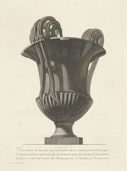 Giovanni Battista Piranesi made this print of an antique vase using etching and engraving techniques. Piranesi was working in 18th century Italy, a time when the Grand Tour was at its peak. His prints catered to wealthy Europeans eager to take home souvenirs of their travels. But Piranesi wasn't simply documenting antiquities; he was actively shaping perceptions of Roman grandeur. The vase, with its intricate carvings and imposing form, embodies the classical ideals that were so admired during this period. Piranesi's skill in rendering these details, combined with the written description of the piece, elevated the object to something more than a mere relic. He transformed it into a symbol of cultural authority. To fully understand Piranesi's work, we might consult period guidebooks, architectural treatises, and even the inventories of Grand Tourists. These sources help us to see how art institutions and the art market helped to shape our experience of the past.