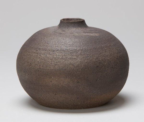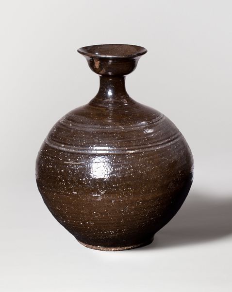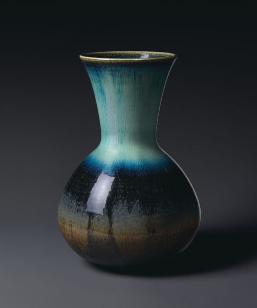 Curator: Good morning! Today, we're taking a closer look at a piece by Albert Robert Valentien, titled "Vase," crafted in 1896. This ceramic work is a wonderful example of the Art Nouveau movement and now resides here at The Art Institute of Chicago. Editor: Wow, my first thought? That's like, mood lighting in a vessel. The dark glaze and that sort of shadowy amber feel—it’s got a sultry kind of vibe, doesn't it? Curator: It certainly does. Valentien, as a figure associated with Rookwood Pottery, really exemplifies how that American art pottery sought to elevate craft into high art, embracing organic forms and unique glazing techniques, like we see here. What statements do you feel that the piece makes, personally? Editor: I think it feels incredibly intimate. The way the light plays across it, the gradient effect... it’s almost like a metaphor for inner transformation. Maybe it feels as if things begin with something murky, gradually transitioning into greater states. What about socially or politically? Curator: Art Nouveau was a movement in and of itself pushing against the industrial age. It embraced craftsmanship in a growing society which could suggest, through a vase, the hope for functional art being equally beautiful. It rejected mass production for an artistry meant for everyday lives. Editor: The vase embodies this sense of escape from an industrializing reality. There’s an aura that’s naturally-inclined to the form and darkness itself—it evokes memories of simpler and naturally based life. This wasn't just decor, it was pushing back against industrial norms. Curator: Exactly! It represents how the artistic output often mirrors the values and anxieties of the culture that produced it, highlighting how seemingly simple artifacts contain deep and historically significant meanings. Editor: To me, this experience is a reminder that looking into what may seem very simple can be truly enriching when done well. This work by Valentien speaks to me with its aesthetic and feeling! Curator: Precisely. Through Valentien's work, we gained a deeper appreciation for the fusion of form, material, and societal intention within the world of art.
