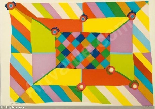 Curator: Standing before us is "Marabaraba No. 1," a piece attributed to Walter Battiss. It's fascinating how Battiss blends what might seem like disparate aesthetics like Pop art and geometric abstraction here. Editor: Whoa, that just vibrated my eyeballs! So bright, so… calculated? Like a Mondrian gone to a carnival. What medium is this? Curator: Without a confirmed date or details about the specific materials used, let's focus on what we see and infer from his known practices. Battiss was invested in printmaking, silkscreen perhaps? I think it’s fair to assess the socio-political environment shaping abstract work and artists. Editor: That would fit. It’s all so clean and flat, like a graphic ad, with lines defining a shape. The way those little striped circles are peppered over the grid gives it almost a game-board feel. Remember those 9 men's morris board games that seem inspired by traditional African culture and social life? Curator: Absolutely, thinking about materiality opens interpretations beyond just geometric pleasure. Could these recurring shapes, the very 'patterns', embody some systematic production of value in the then segregated country. The lines and bold color palettes challenge traditional conceptions. It asks a lot about art. Editor: Hmm, I can almost hear a jaunty 60’s soundtrack in the background, accompanying this! Is that crazy to feel so much lightheartedness coming from a silkscreen? Even with those heavy black lines trying to keep it grounded, it bounces along. I have to know if Battiss enjoyed this creative freedom! Curator: That response is the mark of Pop Art isn't it, blurring joy, social commentary and design. I imagine there was incredible attention to each stage here, too: color choice, compositional harmony. The print making itself has a process and repetitive function and in the content of an art practice, we are asking about value itself. Editor: This reminds me of a game, as art so often is. What if Walter Battiss gave free licence for play, even in a very oppressive moment in history for him, in his culture, during his lifetime? I guess that what is special in the piece is its capacity to resist such classification! Curator: Indeed. "Marabaraba No. 1" embodies the capacity of art to prompt such conversations about design, technique, value and playful liberty. Editor: What a delightful burst of sunshine this has been – time well spent swimming in squares and circles!