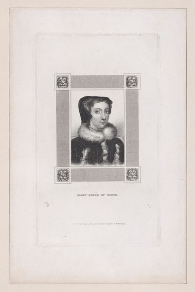 Curator: Let's turn our attention to this print, "Mary, Queen of Scots" by Joseph Brown, created in 1844. It's currently housed here at the Metropolitan Museum of Art. Editor: The starkness immediately strikes me. It's all grays and whites, lending this feeling of…historical remove, maybe even sorrow? You see her confined within that oval frame, with intricate, almost excessive decorative flourishes around the border. Curator: Exactly. Brown wasn't just interested in replicating her likeness. Consider the context. Romanticism was in full swing, idealizing historical figures. Mary, Queen of Scots, became a tragic heroine, particularly in literature and theater. Reproducing images like this fed a public fascination, especially in England, with her contested legacy. Editor: Which leads back to the medium. Engraving was how history became reproducible, widely available. How different it must've been than the original miniature that the engraving is referencing! The labor involved – the meticulous etching – it’s a deliberate act of reproduction and popularization, not just mere decoration, though some would consider engravings as merely applied arts. Curator: It’s interesting you mention that difference in scale. This print makes her accessible in a way a miniature, often a private, courtly object, never could. Mass production via engraving democratized imagery, placing her image into parlors and publications for a burgeoning middle class. The romanticized, even fictionalized, image starts to take precedence over historical complexity. Editor: And what about those adornments in the oval framing her? They feel significant. A sign of her status? Maybe hinting at the context of her story, the opulence but ultimate prison that royalty can be? Curator: Certainly. The flourishes and emblems frame her, both literally and figuratively. Think of how that visual language would speak to 19th-century viewers: the romantic glorification of monarchy mingled with moralistic considerations. This print isn't just a portrait. It's a carefully constructed narrative within the social and aesthetic norms of its time. Editor: So, through both the physical production and cultural reception, an engraving meant more than met the eye. Brown wasn't just presenting Mary; he was actively shaping a vision, accessible for mass consumption. It wasn’t passive but proactive, politically motivated, one might say. Curator: Indeed. What seems a simple reproductive print tells a bigger story about how art disseminates power, how images get mobilized, and the narratives we choose to keep alive through the ages. Editor: This has given me quite a new perspective on engravings; it feels vital to remember they, too, are material records, active participants in cultural movements and social narratives. Thank you for pointing all that out.
