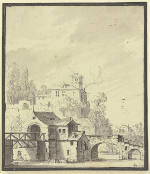 Curator: Francois Morel rendered this tranquil vista, "Gezicht op de Ponte Lucano," between 1796 and 1798, through the medium of engraving. Editor: My immediate impression is one of serenity tinged with melancholy. The composition guides my eye slowly, and the muted tones evoke a sense of fading grandeur. Curator: It’s fascinating how the Ponte Lucano, capped with that robust cylindrical tower, commands the center, doesn't it? The deliberate arrangement, balancing the rustic foreground with the more distant architectural details, echoes prevailing Romantic sentiments regarding humanity's place in the landscape. Editor: Absolutely. Note the distribution of light—how it delicately defines the texture of the stone and subtly shapes the reflections in the water. Semiotically, we see the bridge functions as more than a mere crossing; it signifies the connection between past and present, nature and civilization. Curator: Examining it through a historical lens, it's interesting to see the picturesque interpretation of a monument like this became popular at the turn of the century. Prints such as these helped to propagate specific views and understandings of history within wider society. Editor: And even dictate the very idea of 'taste.' Morel uses linear precision in depicting every stone. Observe how the cows drinking by the shore lend an air of pastoral ideal. The tower, imposing yet crumbling, acts as a memento mori, a reminder of time’s relentless passage. Curator: Indeed, prints such as this often idealized the locations and shaped perceptions of history. We cannot divorce the artistry from these contextual implications of dissemination and perception. Editor: Considering our deconstruction, one admires Morel's masterful balance. His art not only captures a scene, but it provokes deep engagement with questions of memory and beauty itself. Curator: In reflecting on these cultural dimensions of Morel's piece, its complex role as artefact is brought into sharp relief.