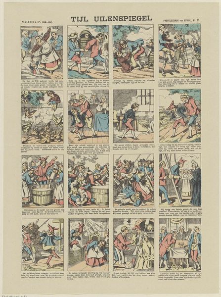 Curator: Here we have “Zestien voorstellingen uit het verhaal van de hut van oom Tom,” which roughly translates to "Sixteen scenes from the story of Uncle Tom’s Cabin," created sometime between 1828 and 1937 by Oehmigke & Riemschnieder. It's an engraving that depicts narrative moments from the novel. Editor: Immediately striking! Sixteen little worlds crammed onto one page! The color palette feels… restrained, but somehow amplifies the drama in each tiny scene. I wonder, is that intentional? It feels like viewing fragmented memories, filtered through the tint of history. Curator: It’s intriguing that you describe the scenes as worlds of their own. The piece relies heavily on the sequential narrative—each frame contributing to the overarching storyline. We see a blend of history-painting and genre-painting informing its overall feel, packaged as a form of popular comic art from the time. Editor: But look how the frames jostle against one another! There's no formal grid structure here, and the scenes aren't of uniform shape or size. I mean, is this to echo the novel's tumultuous, almost chaotic progression? Formally, the absence of clear delineations allows our eyes to bounce, somewhat chaotically, perhaps drawing the eye between moments of hope and despair. The materiality of the print, that fine, engraved line, adds to the intensity, giving us an intricate window into history. Curator: That chaos might also point towards a reading about the novel's reception. The Romantic sensibilities, blended with an abridged interpretation of the narrative and presented in this serialized format, makes me wonder about how audiences at the time might have internalized the themes of slavery and morality. Was it designed to provoke empathy? Or was it to sensationalize the narrative? Editor: Perhaps both? It speaks to the enduring power—and peril—of adapting complex narratives. It distills the grand tale into fragmented glimpses, reshaping our memory. I now have a peculiar fondness for the work’s subtle anarchy. Curator: It is a strange confluence of the grand and the intimate, prompting new and unsettling questions about its time—and ours.