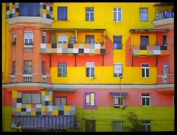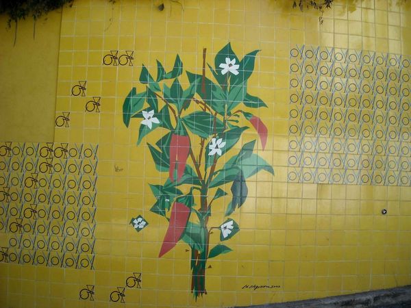 Editor: So this is a ceramic tile panel called "Azulejos" by Carlos Botelho, made in Lisbon in 1957. It's so vibrant! It definitely brightens up the urban landscape. What's your interpretation of it? Curator: Well, placing this artwork in its historical context, post-war Lisbon was undergoing rapid modernization, but under a dictatorship. These azulejos, a very traditional Portuguese craft, served as a kind of public art, often commissioned to uplift public spaces. The use of geometric, almost childlike depictions of city buildings...do you think it hides a purpose? Editor: Possibly? I mean it's very stylized, not realistic at all. Is that intentional in its critique of modernization, or does it fully embrace a sense of utopian possibility? Curator: That's a brilliant point! It’s a fine line, isn’t it? On the one hand, the bright colours and simplified forms could represent a forward-looking optimism, aligning with the regime's public image campaign. On the other, it subtly disrupts the visual language of the Estado Novo, the Portuguese authoritarian government at that time. These murals democratized art, shifting it from galleries to public view. Notice that despite some recognizable buildings, the structures look like flattened building blocks... why is that? Editor: Maybe the abstraction softens any overtly political message and helps with the integration with the buildings? Now that you mention it, it does soften the surroundings through a more decorative and less 'real' take. Curator: Exactly. Think about the dialogue it creates with the street art seen nearby too... How is it used by society in terms of messages? Editor: Good question. Well, I never considered the history or urban function of it... very interesting. Thanks. Curator: My pleasure. I'll definitely keep my eye out to reflect on these aspects of meaning in other murals too.