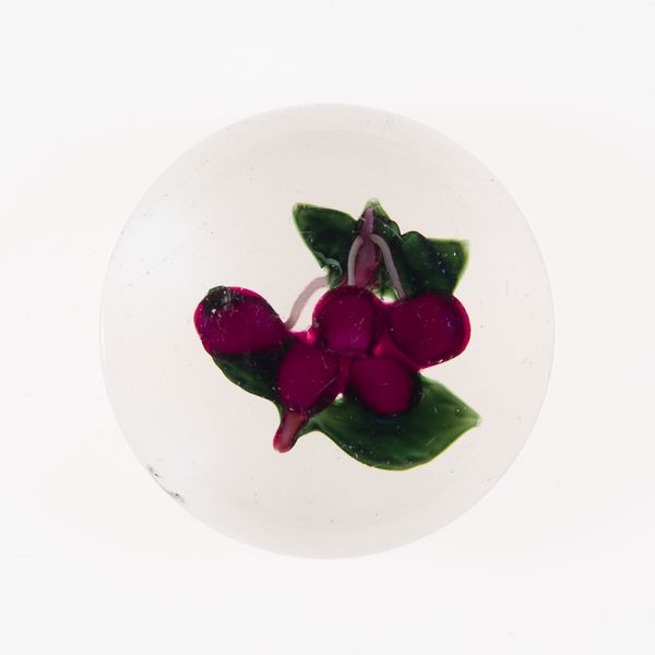 Editor: We are looking at a late 19th-century glass paperweight crafted by the New England Glass Company. I'm struck by the vibrant magenta fading into soft white—it feels almost like a captured sunset. What symbolic weight might have been carried in such an object during its time? Curator: It’s a beautiful specimen, isn’t it? Glass itself is always symbolic, think of transparency and fragility. The sphere is often associated with wholeness and perfection. How does the distortion created by the glass affect your reading? Editor: I hadn’t thought of the distortion, but I suppose it could symbolize the way we perceive memory-- not always accurately. Is there something significant about the colours? Curator: Precisely. Consider the intense magenta, often tied to passion, love, or even royalty. But here, it softens, fades... perhaps symbolizing fleeting beauty, a moment captured and preserved. Does the lone, subtle green element at its core suggest anything to you? Editor: Perhaps a spark of hope or renewal amidst the fading colours? Or could it be a symbol of something growing? It seems isolated though, as if frozen in time... Curator: An intriguing reading! It encourages us to contemplate how seemingly simple objects are loaded with symbolic potential that resonated across different eras, wouldn't you agree? Editor: Definitely! It's amazing how much can be conveyed through color, form, and material when you look closely. Curator: Exactly. Cultural memory isn't just found in grand monuments, it resides even in everyday objects like this.