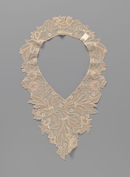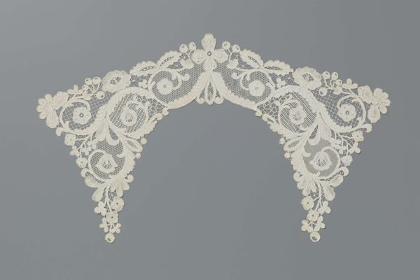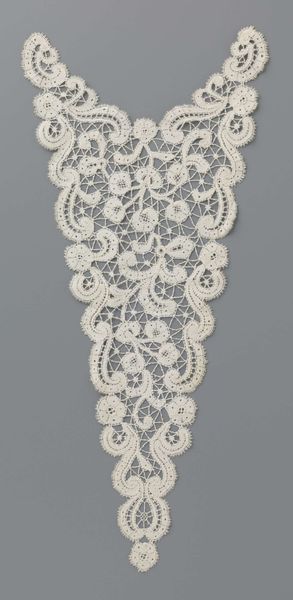 Curator: Look at this stunning vest—dating back to around 1915—fashioned entirely from bobbin lace. Notice the intricate design, the drielobbige waaierbloemen, those fabulous three-lobed fan flowers. Isn't it just the epitome of elegance? Editor: It’s so delicate. There’s an almost ethereal quality to the repeating patterns. Though… looking at it now, I’m wondering, how much sheer labour and patience must have gone into crafting something like this? It seems impossible. Curator: Indeed! And you feel the feminine energy resonating, don't you? These were the times, you see. Editor: Definitely a reflection of the societal constraints of women at the time. This intricate, detailed work – confined to domestic spaces - was often their only means of creative expression. Think of the hidden messages, or not, carefully placed within the pattern's weave. Was she consciously weaving her experiences, hopes, rebellions into this piece? Curator: A garment became a canvas for her emotions, that’s delightful. But the flowers, those stylized fans! Do you feel that it represents hidden secrets, whispered hopes, or maybe even a touch of rebellion masked by polite decorum? It’s whispering untold tales of its creation, surely. Editor: Absolutely, a form of quiet resistance or, maybe just a means of self-preservation through creative occupation. This work wasn't just adornment. It becomes a complex artifact, carrying histories and unspoken narratives with its repetitive motifs and fragile threads. Curator: It is just extraordinary when you consider what was going on in the world. Imagine the artist diligently crafting this piece during that tempestuous era! Now, doesn't that amplify its profound beauty? The resilience! The heart! The sheer bloody audacity! Editor: Right, that’s how material culture offers critical insight, offering the ability to explore social, historical and political climates of this vest's conception and usage. So, how might we situate these works into critical, intersectional narratives? Curator: Yes! It certainly is so wonderful. Now, I'm off to grab myself a celebratory cocktail in honor of the artist who created this. Editor: I’m already thinking about how we can better integrate historical and cultural research in order to emphasize the need for nuanced discourse that focuses on class, race, and gender. Let's keep digging deeper.