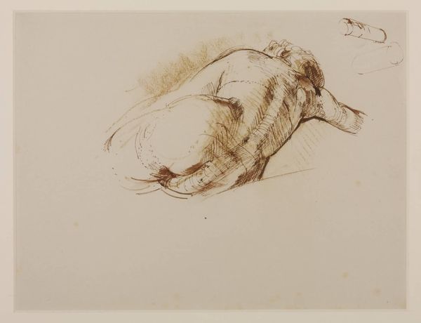 Editor: This is an untitled work, believed to be by Auguste Rodin, and it seems to be a watercolor and pencil drawing of a nude figure. It’s really quite delicate, almost ethereal. What strikes me is the unfinished quality of it, which somehow makes it feel very immediate. What do you see in this piece? Curator: I see a record of the artist's hand and a study in the materiality of art production. Consider Rodin’s labor. Each line, each wash of watercolor, is a physical act, a direct inscription of his body’s movement onto the paper. Look at the quick, almost frantic lines around the figure. What do they tell us about Rodin's process? Editor: They give it a sense of energy, like he was trying to capture a fleeting moment. Curator: Precisely. And beyond the purely aesthetic, we need to consider the social context. What was the status of the artist in Rodin’s time? Someone elevated, set apart. Rodin used inexpensive materials—paper, pencil, watercolor—traditionally associated with studies or preliminary sketches, challenging the hierarchy that prized oil painting above all else. Do you see how the ‘unfinished’ quality actually challenges the very definition of a finished work of art? Editor: Yes, it’s like he’s elevating the process itself, showing the labor involved. I never thought of it that way before. Curator: The act of creation becomes visible, disrupting notions of artistic genius as something divinely inspired. This isn’t about polished perfection; it's about the evidence of work, the mark of the maker, and it questions the traditional boundaries of what is deemed high art versus a preparatory sketch, or even craft. Editor: So, by focusing on the materials and process, we can see how Rodin’s work subtly challenges the established art world? Curator: Exactly. The ‘Untitled’ nature adds another layer – it removes pressure to ascribe conventional meaning, pointing viewers instead to the materials and their manipulation. Editor: That’s a fascinating perspective. I definitely see this piece differently now, thinking about it in terms of materials, process, and social context.