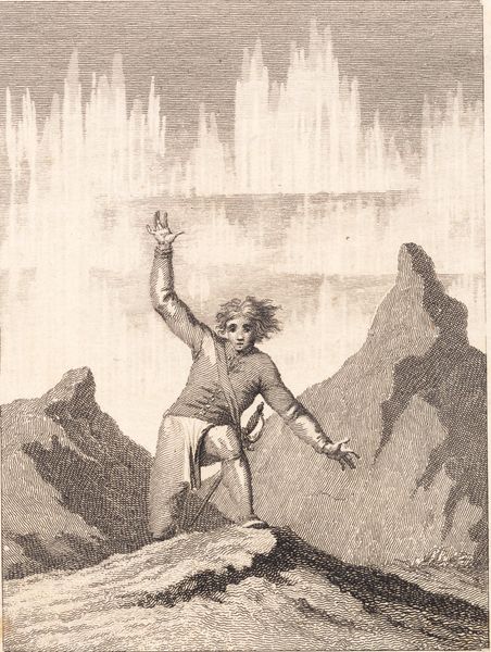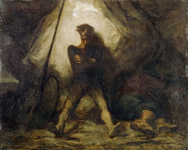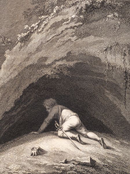 Curator: This captivating wash drawing is by Robert Smirke, active in the late 18th and early 19th centuries. It currently resides in the Tate Collections, though its exact title and date remain unknown. Editor: My first thought? Claustrophobia! The looming rock face, that tiny figure reaching upwards...it feels like a cry for escape. Curator: The figure's upward gaze and outstretched hands are a classic visual motif. He seems to be pleading for divine intervention, or perhaps simply seeking enlightenment. The donkey suggests he is accompanied, yet the focus is solely on him. Editor: Maybe the donkey is his conscience? Or the heavy burden he's trying to leave behind in this cave of despair? The reddish-brown monochrome makes it all feel so weighty, almost suffocating. Curator: The limited palette certainly enhances the drama and directs our attention to the symbolic gesture. Consider the cultural associations of caves, often linked to initiation, transformation, and the subconscious. Editor: It’s a potent image, all right. Makes you want to climb right out of your own metaphorical cave. Curator: Indeed, a powerful reminder of the enduring human search for meaning in the face of adversity.